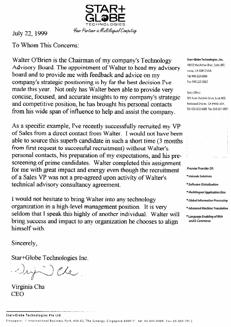July 22, 1999 To Whom This Concerns: Walter O’Brien is the Chairman of my company’s Technology Advisory Board. The appointment of Walter to head my advisory board and to provide me with feedback and advice on my company’s strategic positioning is by far the best decision I’ve made this year. Not only has Walter been able to provide very concise, focused, and accurate insights to my company’s strategic and competitive position, he has brought his personal contacts from his wide span of influence to help and assist the company. As a specific example, I’ve recently successfully recruited my VP of Sales from a direct contact from Walter. I would not have been able to source this superb candidate in such a short time (3 months from first request to successful recruitment) without Walter’s personal contacts, his preparation of my expectations, and his prescreening of prime candidates. Walter completed this assignment for me with great impact and energy even though the recruitment of Sales VP was not a pre-agreed upon activity of Walter’s technical advisory consultancy agreement. I would not hesitate to bring Walter into any technology organization in a high-level management position. It is very seldom that I speak this highly of another individual. Walter will bring success and impact to any organization he chooses to align himself with. Sincerely, Star+Globe Technologies Inc. Virginia Cha |