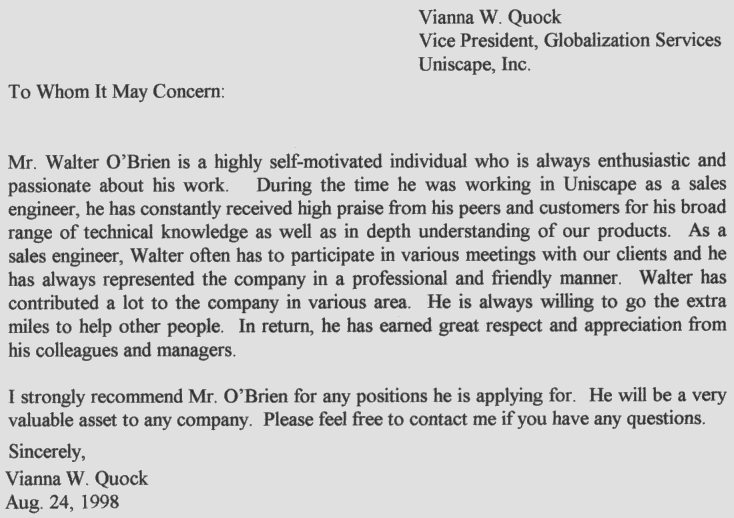 Vianna W. Quock To Whom It May Concern: Mr. Walter O’Brien is a highly self-motivated individual who is always enthusiastic and passionate about his work. During the time he was working in Uniscape as a sales engineer, he has constantly received high praise from his peers and customers for his broad range of technical knowledge as well as in depth understanding of our products. As a sales engineer, Walter often has to participate in various meetings with our clients and he has always represented the company in a professional and friendly manner. Walter has contributed a lot to the company in various area. He is always willing to go the extra miles to help other people. In return, he has earned great respect and appreciation from his colleagues and managers. I strongly recommend Mr. O’Brien for any positions he is applying for. He will be a very valuable asset to any company. Please feel free to contact me if you have any questions. Sincerely, |